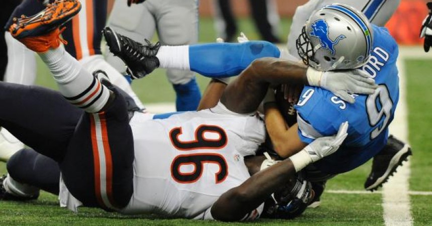Then-Bears defensive end Jarvis Jenkins sacks Lions quarterback Matthew Stafford.