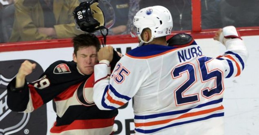 Edmonton Oilers’ Darnell Nurse fights with Ottawa Senators’ Max McCormick during the third period of Thursday’s game.