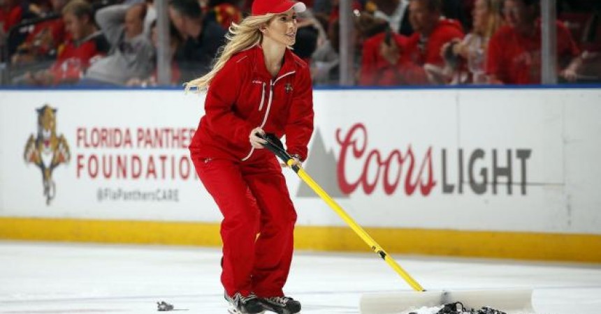 A worker for the Florida Panthers shovels rats off the ice Thursday.