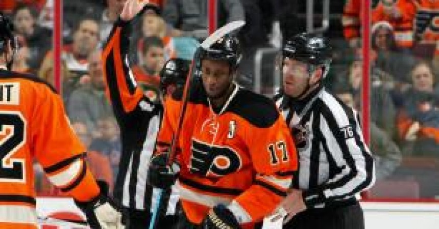 Wayne Simmonds of the Flyers is escorted off the ice after match penalty for hit on Ryan McDonagh.