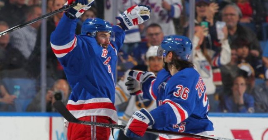 Derick Brassard (l.) puts the Rangers on the scoreboard in Tuesday night's win at Buffalo.Bill Wippert/NHLI via Getty Images