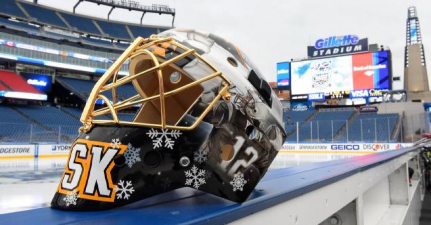 Tuukka Rask’s mask for the Winter Classic at Gillette features Patriots QB Tom Brady.